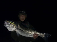 Shimano Twin Power 5000 FB reel. Fireline XDS 0.16mm with a Seagaur Soft 0.33mm leader. Rod, Barros Laredo 300 Spinner. The sea calming after a couple of days of strong waves between 3 and 4 metres. A clear sky but without any moon and pitch black. I go in search of the Pollack for my article. I decide to go to some rocks where they generally bite well. There’s a lot of loose seaweed. I try to find a spot where I don’t accumulate seaweed within 4 turns of the reel. I try everything from my previous entry in this blog. At last after about an hour and a half I get a hit. It doesn’t fight like a Pollack but I can’t confirm it, it gets free, it wasn’t anything of great size but gets me thinking, what if...... I change the lure to a Rapala 15cm yellow Max Rap. The tide’s been coming in for about an hour now. I think, “I should change the spool to a heavier line”, but don’t. Another change of position and I place myself facing the open sea but can’t see a thing. I’m a little nervous because the sea is still quite rough and I feel unprotected. I cast, a slow retrieve with stops to avoid snagging on some rocks I know are right in front of me. Another 3 or 4 casts and hit! It doesn’t seem like a big deal, 2 or 3 turns of the reel and it shoots off like an F1 car. “Why didn’t I change the spool?” I loosen the drag while a thousand things fly through my mind, the line, the knots, the rocks, the waves I can hear crashing like thunder but can’t see then I hear the voice of the master Jedi Carlos AKA sargoloco, “the force is with you” I take control of the situation and direct my adversary to calmer waters away from the rocks. He makes me go around the rocks as I jump from one to another (a good thing I know them like the back of my hand). At last I see it. It’s already tired and I manage to keep its’ head out of the water. A wave is on my side and spits it into a shallow pool. I reach for it, grab it under the gills and it’s miiiiine!